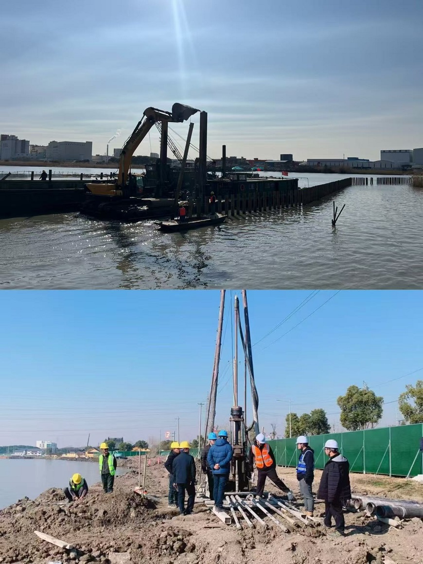 【概要描述】2月13日,在扬州水利建筑程有限责任满冠(中国)承建的吴淞江(江苏段)整治工程(昆山市)施工八标建设现场机械轰鸣、车辆穿梭,工人们分工合作、干劲十足,现场一片繁忙。 项目部在春节放假前抢抓时间完成了水泥搅拌桩、管桩、灌注桩试桩,充分利用假期时间提高强度以满足检测要求。2月9日管理人员到岗后,实时调整进度计划,精心组织各专业施工班组到位,将3公里施工区域划分为9个工区,护岸桩基目前进入全面铺开施工阶段,水