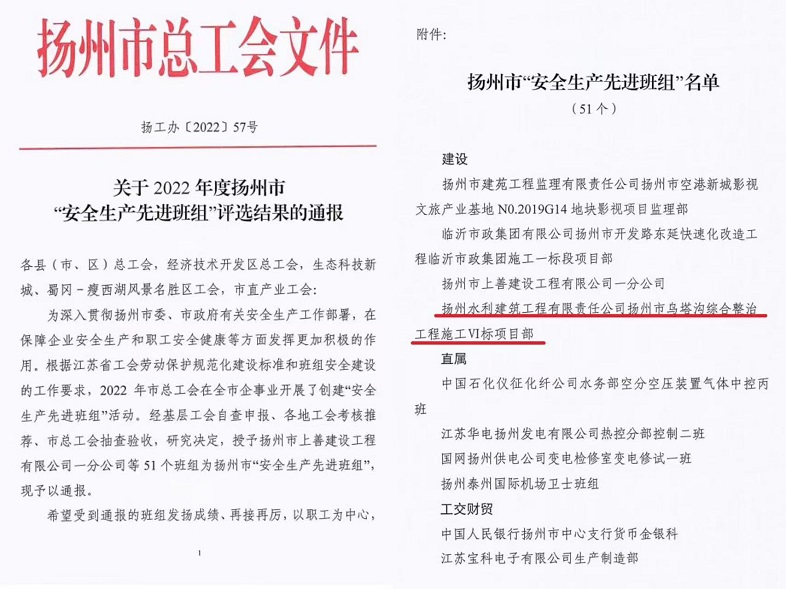 近日,市总工会发文表彰了2022年度市“安全生产先进班组”,满冠足球乌塔沟综合整治施工VI标项目部在此次评选中脱颖而出,被授予该项荣誉称号。