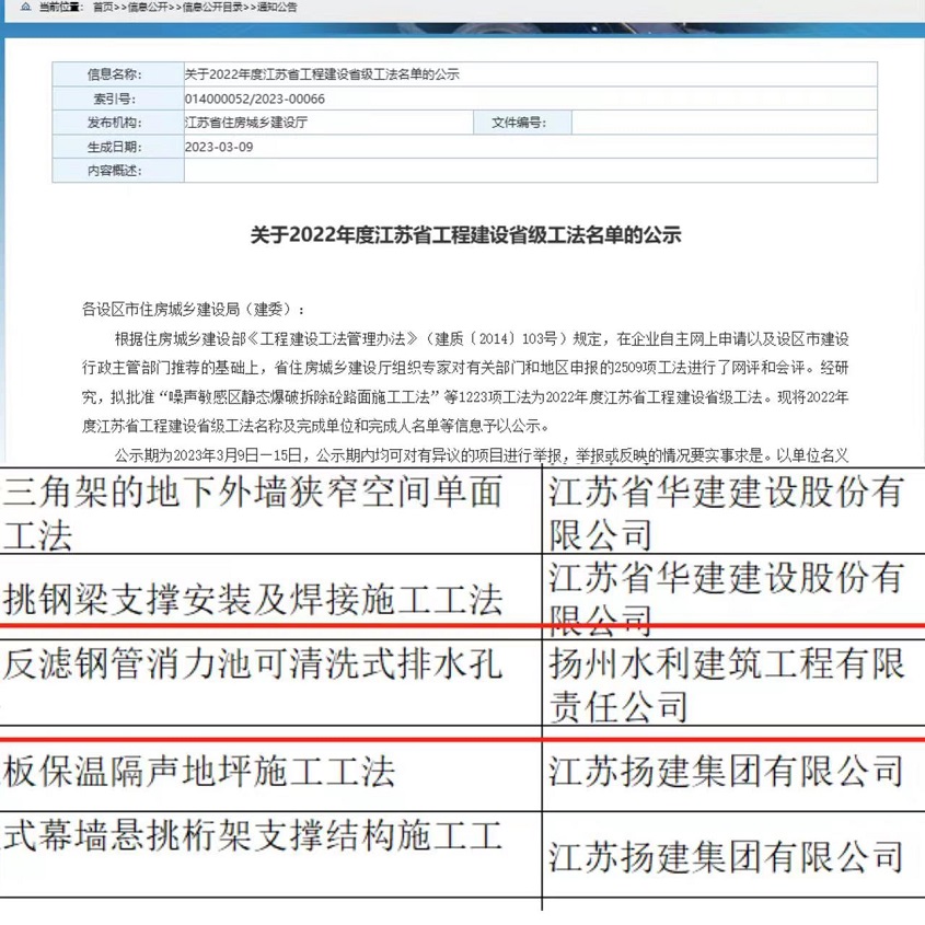 近日,江苏省住房和城乡建设厅公布了2022年度江苏省工程建设省级工法名单,满冠足球申报的《基于可拆反滤钢管消力池可清洗式排水孔施工工法》通过评审,获评2022年度江苏省工程建设省级工法。